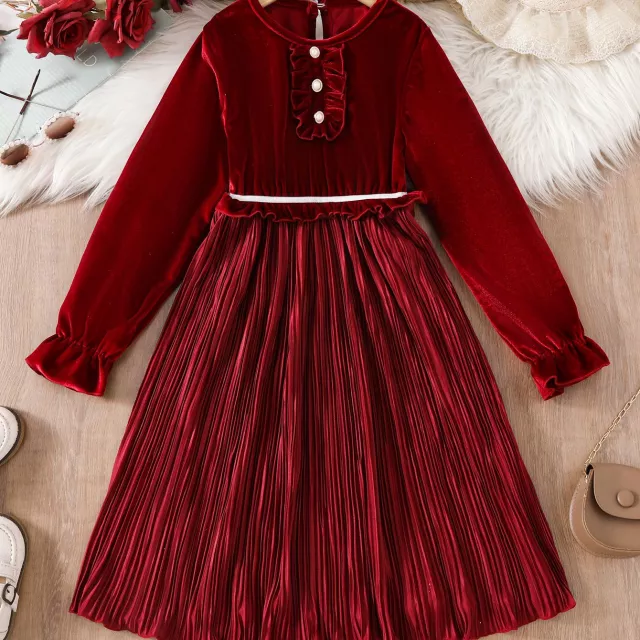 Made from premium velvet fabric, this long-sleeve dress feels smooth against the skin and keeps your girl warm on chilly days. The delicate pearl buttons and ruffled bodice add a touch of timeless elegance, while the pleated A-line skirt creates a graceful silhouette that’s perfect for twirling and dancing. Its O-neck design and mid-calf length make it easy to pair with cardigans, tights, or boots for a complete seasonal look.