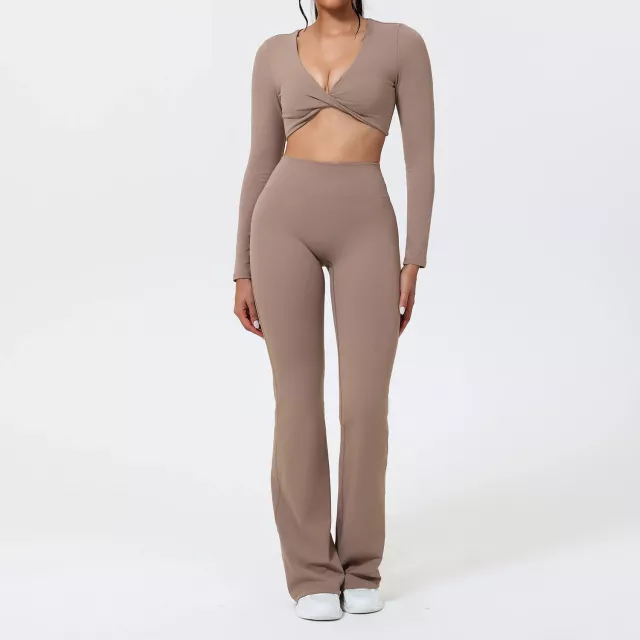 Step into comfort and style with this 2-piece activewear set designed for the modern woman. Featuring a twist-knot long-sleeved cropped sports top and high-waisted flared yoga pants, this set combines fashion and function effortlessly. Made with a soft and stretchy blend of polyester and spandex, it moves with your body, offering ultimate flexibility whether you’re hitting the yoga mat, running errands, or relaxing at home.